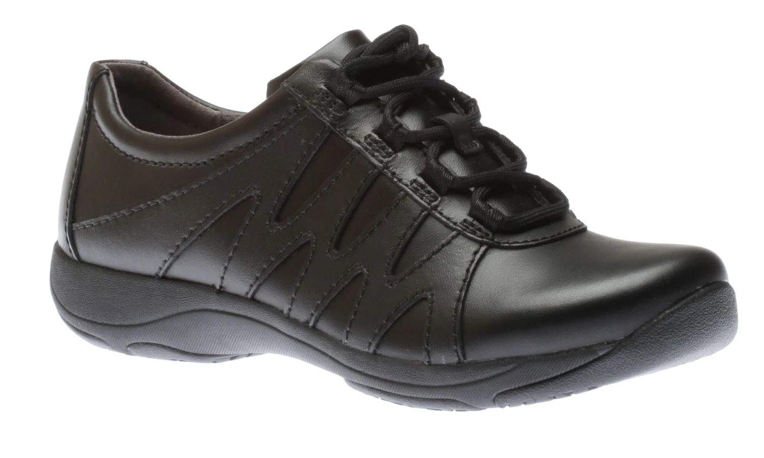 Head to work in comfort wearing Neena. This lace up sport-inspired shoe features stain-protected black leather uppers and a black outsole, soft textile linings for all-day comfort, a removable footbed with Dansko Natural Arch technology, contoured PU footbed with memory foam and built-in arch support for all-day comfort, and a rubber outsole for long-lasting wear.