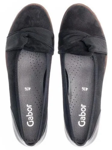 The Gabor 54.107.17 black suede ballet flats are practical, chic and comfortable. Featuring a soft suede upper, there is a pretty deconstructed bow detail at the toe, a leather overlay panel at the heel and a distinct rugged sole. These flats will transition well from the office, to commuting to and from work or running errands around town. Â