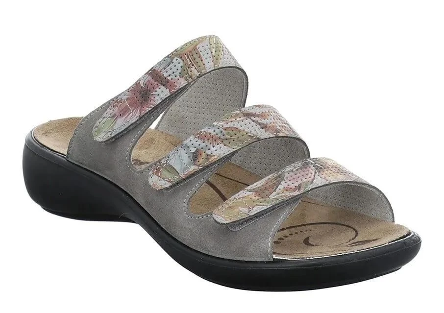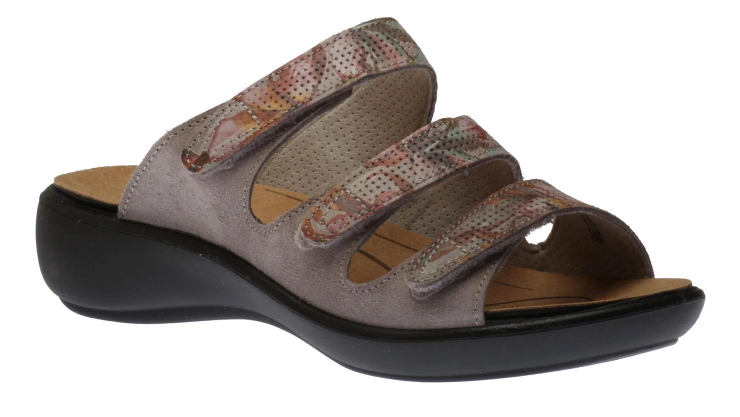 The Ibiza 106 slide sandal is for the woman on the go! This is a fresh take on the classic Romika slide sandals. Elevated with a barely there wedge heel that provides you with stable support, the sandal features three adjustable straps with Velcro closure which ensures a secure and comfortable fit and an easy on and off. The sandal also features some perforations and a flower print detail on the straps. Inside, a smooth textile lining and a soft microvelour cushioned footbed provide breathable comfort and support to ensure soft, fatigue-free walking.