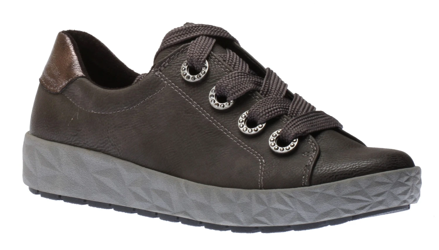 This sleek and modern lace-up sneaker by Relife is ready to move down the city streets with some serious attitude. This sneaker features a faux leather upper, a contrasting metallic heel tab, a burnished toe, embellished shoe lace eyelets and a shock-absorbing sole.
