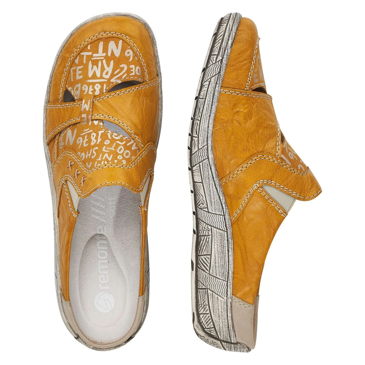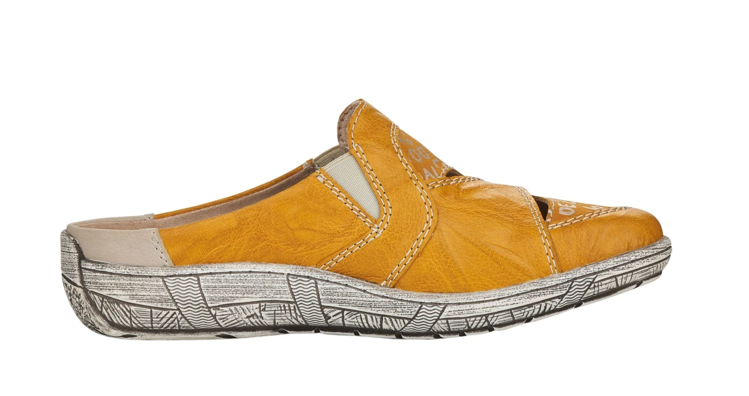 This Massa backless slip-on shoe features a sunny yellow leather upper with silver handwritten style letters, a round toe and dual elastic gores for a flexible fit. Contrast stitching and mini cutouts enhance the style of this mule. A soft velour lining and lightweight anti-stress footbed deliver optimal cushioning and shock-absorption for all-day comfort. A durable, flexible, lightweight, thermoplastic rubber outsole delivers maximum shock-absorption and stable traction.