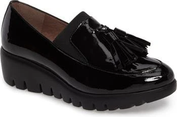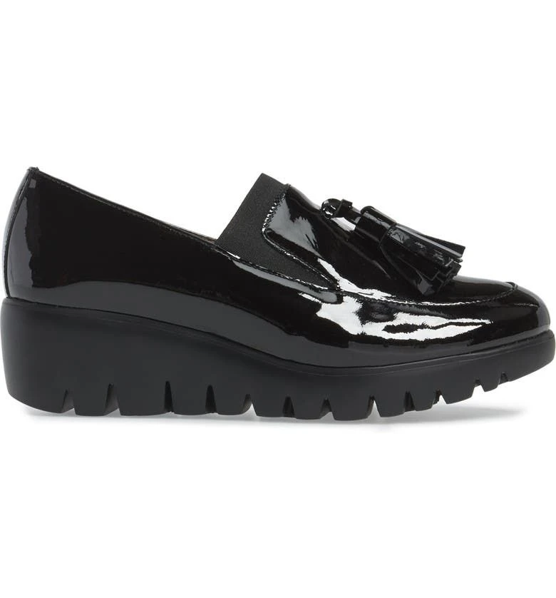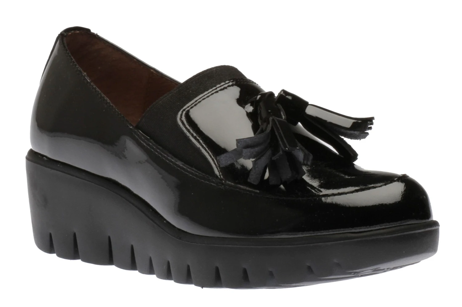 This chic slip-on loafer features a patent leather upper with dangling tassels for a classic look. An elastic gore at the vamp ensures a secure flexible fit and an easy on-and-off. A soft leather / textile lining and lightly cushioned footbed provide breathable comfort and support. A durable, lightweight, lugged, PU outsole delivers secure shock-absorbing traction. Wedge heel measures 1.75 inches. Platform height: 0.75 inches. Made in Spain.
